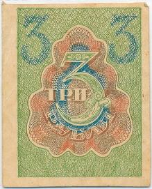 Аверс: фон зеленый. В центре герб - РСФСР, по углам цифры номинала - 3.