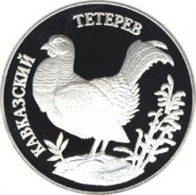 Реверс: изображение кавказского тетерева на фоне растительности, вверху слева над изображением - надпись по окружности: "КАВКАЗСКИЙ ТЕТЕРЕВ".