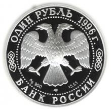 Аверс: изображение двуглавого орла (художник И. Билибин), по кругу надписи: вверху - "ОДИН РУБЛЬ 1996 г.", внизу - "БАНК РОССИИ".