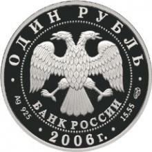 Аверс: в центре диска – эмблема Банка России (двуглавый орел с опущенными крыльями, под ним надпись полукругом «БАНК РОССИИ»), обрамленная кругом из точек и надписями по кругу: вверху – «ОДИН РУБЛЬ», внизу – «2006 г.», слева – обозначение металла, проба сплава, справа – содержание драгоценного металла в чистоте и товарный знак монетного двора.