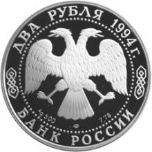Аверс: изображение двуглавого орла (художник И. Билибин), по кругу надписи: вверху - "ДВА РУБЛЯ 1994 г.", внизу - "БАНК РОССИИ".