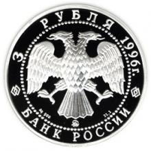 Аверс: изображение двуглавого орла (художник И. Билибин), по кругу надписи: вверху - "3 РУБЛЯ 1996", внизу - "БАНК РОССИИ". В нижней части - обозначение металла, проба сплава, содержание драгоценного металла в чистоте и товарный знак монетного двора.