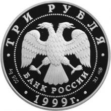 Аверс: в центре диска — эмблема Банка России (двуглавый орёл художника И. Билибина, под ним надпись полукругом «БАНК РОССИИ»), обрамлённая кругом из точек и надписями по кругу: вверху — «ТРИ РУБЛЯ», внизу — «1999 г.», слева — обозначение металла, проба сплава, справа — содержание драгоценного металла в чистоте и товарный знак монетного двора.