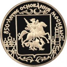 Аверс: изображение герба Москвы с Георгием Победоносцем на коне, пронзающим копьем крылатого змия. Вверху по окружности надпись: «850-летие ОснованиЯ Москвы».