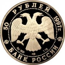 Реверс: изображение двуглавого орла (художник И. Билибин), по кругу надписи: вверху — «50 РУБЛЕЙ 1997 г.», внизу — «БАНК РОССИИ». В нижней части — обозначение металла, проба сплава, содержание драгоценного металла в чистоте и товарный знак монетного двора.