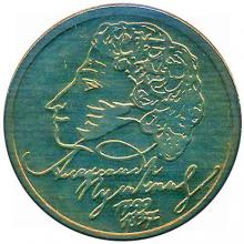 Реверс: профильный автопортрет А.С.Пушкина, под ним — в четыре строки подпись факсимиле «АЛЕКСАНДР ПУШКИН» и даты «1799» «1837».