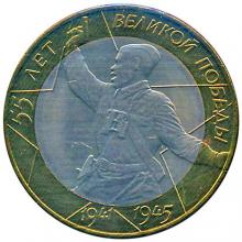 Аверс: в центре диска - обозначение достоинства монеты "10 РУБЛЕЙ".