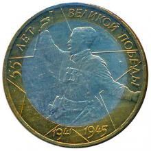 Реверс: изображения солдата и контура пятиконечной звезды, переходящие с диска на кольцо. В верхней части кольца по окружности - надпись: "55 ЛЕТ ВЕЛИКОЙ ПОБЕДЫ", в нижней части - даты "1941" "1945".