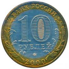 Аверс: в центре диска - обозначение достоинства монеты "10 РУБЛЕЙ". Внутри цифры "0" - скрытые, видимые поочередно при изменении угла зрения изображения цифры "10" и надписи "РУБЛЕЙ". В нижней части диска - товарный знак монетного двора. В верхней части кольца по окружности - надпись: "БАНК РОССИИ", в нижней - дата "2000", слева и справа - стилизованные ветви растений, переходящие на диск.