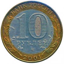 Аверс: в центре диска — обозначение достоинства монеты «10 РУБЛЕЙ». Внутри цифры «0» — скрытые, видимые поочередно при изменении угла зрения изображения цифры «10» и слова «РУБЛЕЙ». В нижней части диска — товарный знак монетного двора. В верхней части кольца по окружности — надпись: «БАНК РОССИИ», в нижней — дата «2001», слева и справа — стилизованные ветви растений, переходящие на диск.