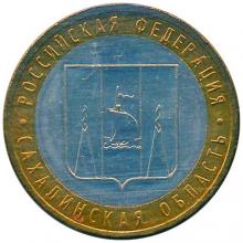 Реверс: изображение герба Сахалинской области, по окружности – надписи: вверху – «РОССИЙСКАЯ ФЕДЕРАЦИЯ», внизу – «САХАЛИНСКАЯ ОБЛАСТЬ».