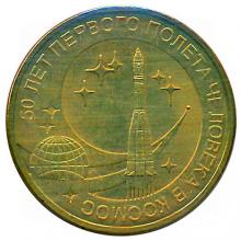 Реверс: в центре диска монеты на фоне звездного неба - изображение стартующей космической ракеты, слева - изображение планеты, круговая надпись: "50 ЛЕТ ПЕРВОГО ПОЛЕТА ЧЕЛОВЕКА В КОСМОС", расположенная на широкой полосе вдоль канта.