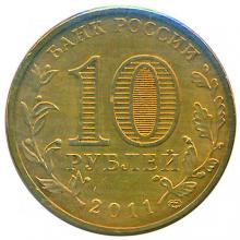 Аверс: в центре диска - обозначение номинала монеты "10 РУБЛЕЙ". Внутри цифры "0" - скрытые, видимые поочередно при изменении угла зрения изображения цифры "10" и надписи "РУБ". По окружности вдоль канта - надписи, вверху: "БАНК РОССИИ", внизу - дата: "2011", слева - стилизованное изображение оливковой ветви, справа - дубовой.