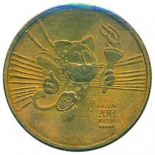 Реверс: в центре диска на фоне графических контуров стадиона - стилизованное рельефное изображение официального талисмана Универсиады в виде бегущего с факелом котенка крылатого снежного барса - национального символа Республики Татарстан, справа внизу - логотип Универсиады (надпись в четыре строки: "UNIVERSIADE KAZAN 2013 RUSSIA", исполненная шрифтами разных размеров, под нею пять звездочек) и эмблема Универсиады (стилизованное графическое изображение тюльпана), расположенная слева от логотипа.
