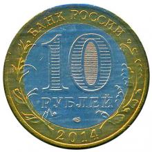 Аверс: на кольце по окружности расположены надписи: в верхней части — «БАНК РОССИИ», в нижней части — «2014». Слева и справа на внешнем кольце расположены изображения ветви лавра и дуба соответственно, элементы изображения которых переходят на диск. В центре диска расположены число «10» и надпись «РУБЛЕЙ» под ним, обозначающие номинал монеты. Внутри цифры «0» имеется защитный элемент в виде числа «10» и надписи «РУБ», наблюдаемых под разными углами зрения к плоскости монеты. В нижней части диска расположен товарный знак монетного двора.