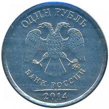 Аверс: рельефное изображение эмблемы Банка России — двуглавого орла с опущенными крыльями, под ним надпись полукругом «БАНК РОССИИ», имеются надписи: товарный знак монетного двора, верху по окружности — номинал монеты «ОДИН РУБЛЬ», внизу под линией, разделенной посередине точкой, — год чеканки монеты «2014».