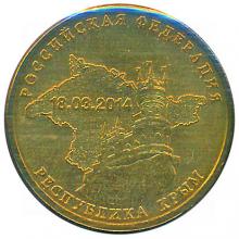Реверс: на фоне контурных очертаний Крымского полуострова в центре – дата "18.03.2014", справа – рельефное изображение архитектурного памятника "Ласточкино гнездо" возле Гаспры, вдоль канта – надписи, вверху: "РОССИЙСКАЯ ФЕДЕРАЦИЯ", ВНИЗУ: "РЕСПУБЛИКА КРЫМ".