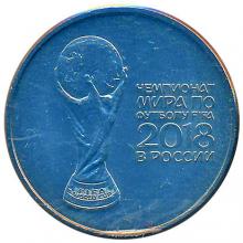 Реверс: рельефное изображение Кубка Чемпионата мира по футболу FIFA, справа – надпись в пять строк: "ЧЕМПИОНАТ МИРА ПО ФУТБОЛУ FIFA 2018 В РОССИИ".
