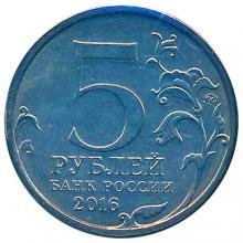 Аверсв центре диска – обозначение номинала монеты в две строки: "5 РУБЛЕЙ", ниже – надпись: "БАНК РОССИИ", под ней – год чеканки: "2016", слева и справа – стилизованная ветка растения, справа у канта – товарный знак монетного двора.