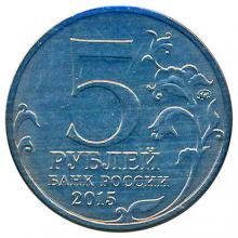 Аверс: в центре – обозначение номинала: "5 РУБЛЕЙ", ниже – надпись: "БАНК РОССИИ", под ней – год выпуска "2015", справа у канта – товарный знак монетного двора, слева и справа – фрагменты растительного орнамента.