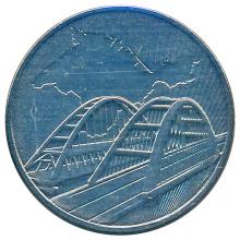 Реверс: рельефное изображение моста, возведенного над Керченским проливом и соединяющего материковую часть России и полуостров Крым, на фоне стилизованной карты Крымского полуострова и расходящихся лучей.
