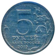 Аверс: в центре диска – обозначение номинала монеты в две строки: "5 РУБЛЕЙ", ниже – надпись: "БАНК РОССИИ", под ней – год чеканки: "2019", слева и справа – стилизованные ветви растения, справа у канта – товарный знак монетного двора.