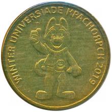 Реверс: рельефное изображение талисмана XXIX Всемирной зимней универсиады U-Лайки, вдоль канта – надпись: "WINTER UNIVERSIADE КРАСНОЯРСК 2019".