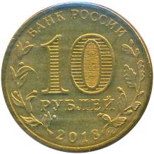 Аверс: в центре – обозначение номинала монеты: "10 РУБЛЕЙ", внутри цифры "0" – скрытые, видимые поочередно при изменении угла зрения изображения числа "10" и надписи "РУБ", cлева и справа стилизованные изображения ветви лавра и дуба соответственно, вдоль канта вверху – надпись: "БАНК РОССИИ", внизу – год выпуска "2018", справа от него – товарный знак монетного двора.