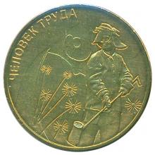 Реверс: стилизованные изображения металлурга в защитной одежде в процессе работы, ковша с расплавленным металлом и летящих искр; слева вверху – надпись: "ЧЕЛОВЕК ТРУДА".
