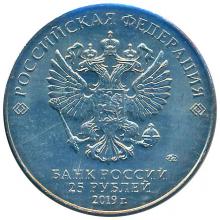 Аверс: в центре – рельефное изображение Государственного герба Российской Федерации, над ним вдоль канта – надпись полукругом: "РОССИЙСКАЯ ФЕДЕРАЦИЯ", обрамленная с обеих сторон сдвоенными ромбами, под гербом в центре в три строки – надпись: "БАНК РОССИИ", номинал монеты: "25 РУБЛЕЙ", год выпуска: "2019 г.", справа – товарный знак монетного двора.
