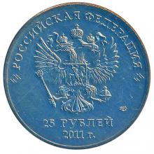 На груди орла, в щите - всадник в плаще на коне, поражающий копьем опрокинутого навзничь и попранного конем дракона), вверху вдоль канта - надпись полукругом: "РОССИЙСКАЯ ФЕДЕРАЦИЯ", обрамленная с обеих сторон орнаментом в виде сдвоенных ромбов, в нижней части диска, у канта - горизонтальная надпись: "25 РУБЛЕЙ", под ней - дата: "2011 г.", над ней справа - товарный знак монетного двора.