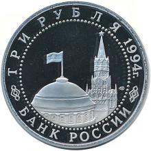 Аверс: изображения фрагмента здания Кремлёвского дворца, Спасской башни Московского Кремля и товарный знак монетного двора, по окружности надписи, разделённые орнаментом: вверху - "ТРИ РУБЛЯ" "1994 г.", внизу - "БАНК РОССИИ".