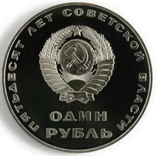 Аверс: в средней части поля по центру герб СССР. Под ним номинал "ОДИН РУБЛЬ", написанный словами в две горизонтальные строки. От первой до последней буквы слова "РУБЛЬ" по окружности, примыкающей к внешнему контуру монеты, надпись "ПЯТЬДЕСЯТ ЛЕТ СОВЕТСКОЙ ВЛАСТИ".