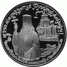 Аверс: слева изображен Иоанн Вениаминов, справа - корабль.
