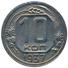 Реверс: в центре восьмиугольный щиток, в нем номинал "10 коп", написанный в две строки.