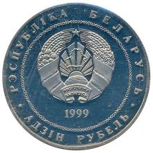 Аверс: в круге, обрамленном геометрическим орнаментом, – рельефное изображение Государственного герба Республики Беларусь, под ним указаны год чеканки, по кругу – надписи: в верхней части – "РЭСПУБЛIКА БЕЛАРУСЬ", в нижней – "АД3IH РУБЕЛЬ".