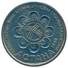 Реверс: в центральной части изображена эмблема презентации города Астаны - новой столицы республики. Элементы эмблемы, окружающие шанырак, образуют орнаментально- декоративное изображение цветка. В нижней части расположена надпись "АСТАНА". По окружности размещается надпись на казахском и русском языках " ҚАЗАҚСТАННЫҢ ЖАҢА АСТАНАСЫ. НОВАЯ СТОЛИЦА КАЗАХСТАНА". Справа, в нижней части, дата "1998" обозначающая год чеканки монеты.