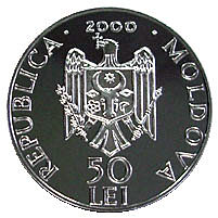 В верхней части – цифра „2000”, в нижней части – надпись „50 LEI”, по окружности монеты – заглавными буквами выгравирована надпись „REPUBLICA MOLDOVA”.