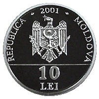 В верхней части – цифра „2001”, в нижней части – надпись „10 LEI”, по окружности монеты – заглавными буквами выгравирована надпись „REPUBLICA MOLDOVA”.