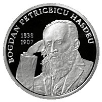 Аверсв центре  - изображение Богдана Петричейку Хашдеу, в верхней части по окружности монеты - заглавными буквами выгравированы надпись „ BOGDAN PETRICEICU HASDEU ” и даты „1838-1907”.