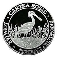 Аверс: в центре – на фоне растительности, колпица, по окружности монеты - заглавными буквами выгравированы надписи “CARTEA ROŞIE”, „LOPĂTAR”, „PLATALEA LEUCORODIA”.