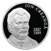 Аверс: в центре - изображение Иона Крянгэ и годы жизни „1837-1889”, в правой части, по окружности монеты, заглавными буквами выгравирована надпись „ION CREANGĂ”.