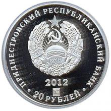 По кругу – надписи: вверху – «ПРИДНЕСТРОВСКИЙ РЕСПУБЛИКАНСКИЙ БАНК», внизу – «20 РУБЛЕЙ»; в нижней части под гербом – год выпуска монеты «2012», логотип изготовителя, обозначение металла, проба сплава, масса.
