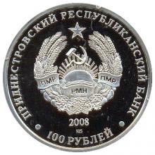 По кругу надписи: вверху – «ПРИДНЕСТРОВСКИЙ РЕСПУБЛИКАНСКИЙ БАНК», внизу – «100 РУБЛЕЙ».