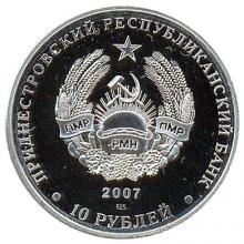 По кругу надписи: вверху – «ПРИДНЕСТРОВСКИЙ РЕСПУБЛИКАНСКИЙ БАНК», внизу – «10 РУБЛЕЙ».