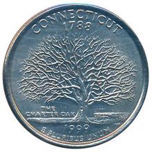 Аверс: "Дуб Хартии". Надпись - "The Charter Oak" (Дуб Хартии). Под названием штата CONNECTICUT год 1788 - год присоединения к США (9 января).