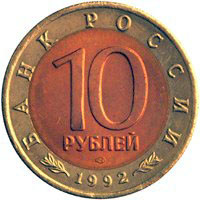 Аверс: в центре диска - надпись в две строки "10 РУБЛЕЙ", под ней - товарный знак монетного двора, по окружности - надписи, разделённые орнаментом: вверху - "БАНК РОССИИ", внизу - "1992".