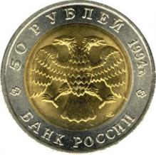 Аверс: изображение двуглавого орла (художник И. Билибин), по окружности надписи, разделённые орнаментом: вверху - "ПЯТЬДЕСЯТ РУБЛЕЙ" "1994", внизу - "БАНК РОССИИ".
