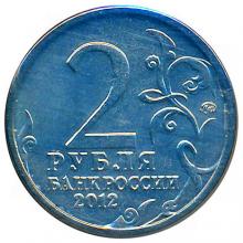 Аверс: в центре диска - обозначение номинала монеты в две строки: "2 РУБЛЯ", ниже - надпись: "БАНК РОССИИ", под ней - год чеканки: "2012", слева и справа - стилизованная ветка растения, справа у канта - товарный знак монетного двора.