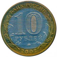 Аверс: в центре диска - обозначение достоинства монеты "10 РУБЛЕЙ". Внутри цифры "0" - скрытые, видимые поочередно при изменении угла зрения изображения цифры "10" и надписи "РУБ". В нижней части диска - товарный знак монетного двора. В верхней части кольца по окружности - надпись: "БАНК РОССИИ", в нижней - дата "2002", слева и справа - стилизованные ветви растений, переходящие на диск.